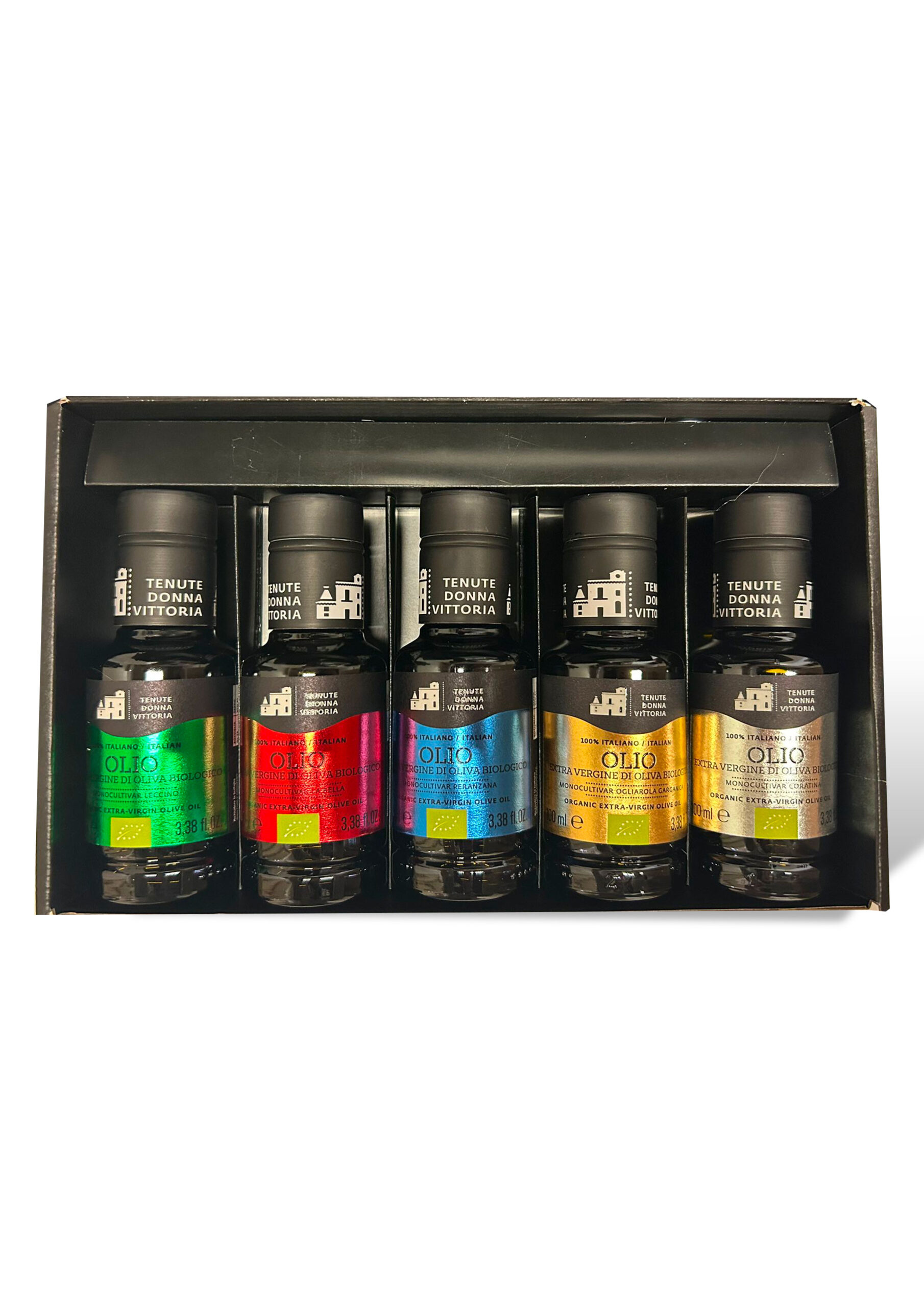 Siamo orgogliosi di presentare l’esclusiva box degustazione di oli d’oliva di altissima qualità, raccolti a mano da alberi secolari. Il primo olio, monocultivar Ogliarola Garganica 100%, ha un fruttato medio e sentori di erbaceo, mandorla e frutta fresca che lo rendono ideale per condire pesce e carni bianche. Certificato BIO e EVO, questo olio garantisce la massima freschezza e qualità. Il secondo olio, monocultivar Coratina 100%, ha un fruttato intenso e sentori di erba appena tagliata, carciofo, pepe e pomodoro che lo rendono perfetto per condire zuppe e carni rosse. Anche questo olio è certificato BIO e EVO. Il terzo olio, monocultivar Peranzana 100%, regala un fruttato medio con note avvolgenti di erbe aromatiche, pomodoro e un leggero tocco di mandorla. Perfetto per insalate, verdure grigliate, pasta fresca e piatti di carne rossa, dona un’esperienza sensoriale unica e raffinata. Il quarto olio, monocultivar Leccino 100%, offre un fruttato medio con note erbacee, mandorla e freschezza di frutta appena raccolta. Perfetto per pesce, carni bianche, pasta e pizza, dona un tocco leggero e raffinato. Certificato BIO ed EVO, è filtrato e imbottigliato con cura per un’esperienza sensoriale di qualità superiore. Infine, l’olio monocultivar Bella di Cerignola 100%, un gioiello dell’arte olearia pugliese, si distingue per il suo fruttato medio, con delicate note di carciofo, pomodoro, mandorla fresca e un lieve sentore di fave. Ideale per chi cerca un equilibrio tra delicatezza e complessità nei propri piatti.